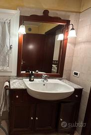 Mobile bagno in legno con base in marmo, specchio con faretti. Il lavandino ha un segno per questo che lo vendo ad un costo piu basso.