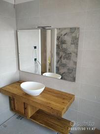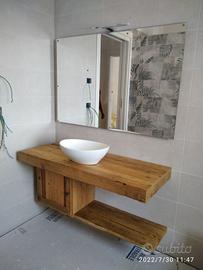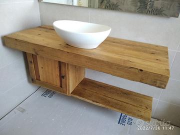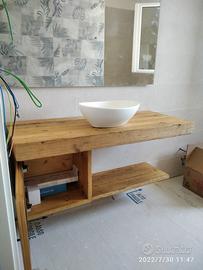 01 mensola da bagno in legno vecchio recuperato di antichi solai spazzolati e carteggiati e levigati in modo che sai morbido al tatto con misure lungh.120 prof.50 h 8 cm. fascia applicata a 45° fissata con apposita ferramenta lamello nei 3 lati senza che si veda la testa del legno. 02 supporto staffe per mensola sotto al piano costruito in ferro quadrato e piastra da applicare al muro, 2 perni regolabili in modo da mettere a bolla la mensola e viti da fissare la mensola direttamente alla staffa per poi applicare lavello d'appoggio. predisposto con fori per scarico e rubinetto su una mensola.