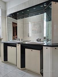 Mobile bagno con 2 lavabi (inclusi), ampia specchiera e comodi vani. Dimensioni: 215 x 63 cm, h 193 cm (necessari +36 cm sul fronte e +25 cm sul ambo i lati per apertura sportelli). Smontaggio e trasporto da concordare.