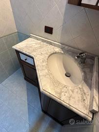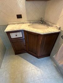 Vendo mobile da bagno angolare in legno con top in marmo e specchiera, ideale per ottimizzare gli spazi. il mobile è in ottime condizioni e completo di tutto. Misure: larghezza cm 103,5, profondità massima 68 cm, altezza cm 84. Ritiro a carico dell' acquirente.