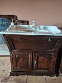 Vendo elegante mobile da bagno Antico Toscano, in legno massello scuro con piano in marmo bianco e ampia specchiera abbinata completa di applique laterali.
