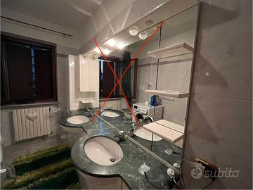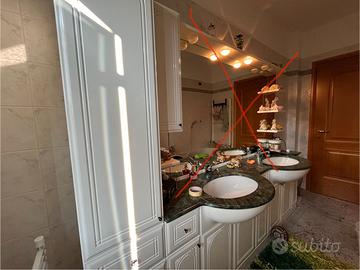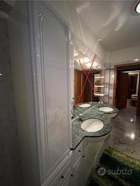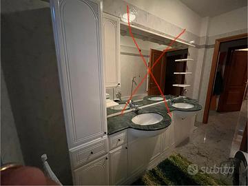 Mobile bagno laccato bianco con piano in marmo verde e doppio lavandino. SENZA SPECCHIO. misure: lunghezza 2,50mt altezza 1,97mt profondità 0,37mt profondità lavandini 0,65mt non spedisco e non consegno.