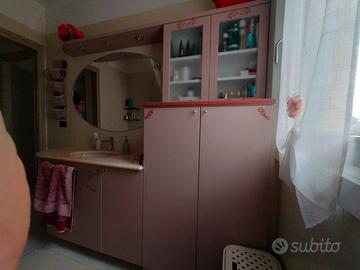 Mobile artigianale completo da bagno con piano in marmo Rosa Portogallo di spessore 3cm, specchio ovale misura 135x88cm, mobile per copertura lavatrice piccola di profondità massima 45cm e con la parte superiore con due ante in vetro, ante e cestone con sistema di chiusura rallentato il tutto misura di ingombro 250x60 e di altezza 2 metri, prezzo trattabile...