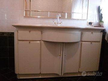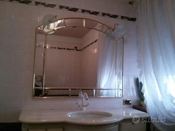 Mobile bagno bianco laccato, con specchio cromatura dorata, marmo con venatura rosa portogallo, lavabo ovale, misure sporgenza massima piano in marmo 65 cm, lunghezza mobile 142 cm. Specchio con 2 luci, rubinetto compreso.