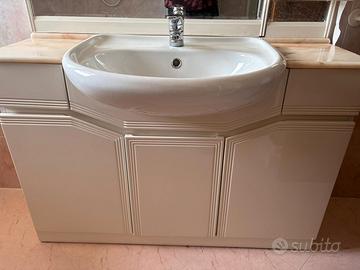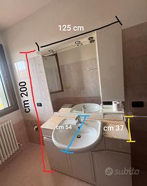 mobile bagno bianco con panno in marmo sfumato rosa/salmone, ampio specchio con faretti (lampadine non incluse ), anta lunga a lato dello specchio, sotto al lavandino 3 anta e ai lati due cassetti. compreso di lavandino. misura cm 125 x cm 37 (mobile) - cm 54 (con lavandino ) x cm 200 altezza. * SOLO ritiro a domicilio *