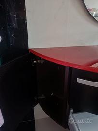 Mobile bagno BMT, robusto ed in perfetto stato. Marrone mogano, top in vetro rosso e lavello in vetro trasparente. Rubinetto a cascata e click clack per lo scarico. 150 cm di lunghezza e circa 53 di profondità con forma a mezzaluna come in foto.