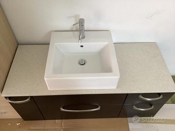 Vendo mobile bagno in legno scuro, con piano in okyte beige, in ottime condizioni Misure 125x50x50. Specchio con lampada, 90x70 Disponibili anche altri elementi di arredo in buone condizioni (Mobile TV, appendi abiti, settimanale)