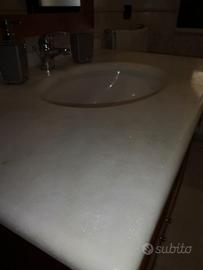 Mobile bagno in legno composto da una base lavabo misure cm 100/83/60 con top in marmo spessore cm 3, colonna cm 40/179/33 e specchio cm 80x105.