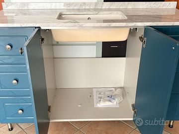 Mobile bagno marca CIMA, colore turchese lucido, con 6 cassetti laterali ( 3 per lato) e 2 ante centrali con pomoli argentati. Piano in marmo con alzatina, lavabo sottopiano.