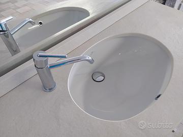 Vendo, per cambio arredamento, mobile bagno composto come da foto, laccato lucido, composto da mobile con top in marmo, rubinetteria Frisone, lavabo Ideal Standard (larghezza 146cm * profondità massima 52cm, lato corto 36cm * altezza 89cm); specchio con faretti e retro illuminato (larghezza 140cm * altezza 100cm). Colonne già vendute. Viteria completa. Tutto già smontato e pronto per il trasporto.