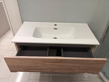 Causa svendita, svendo mobile bagno completo come in foto, color rovere naturale, 90x45, 2 cassetti con lavabo integrato in ceramica e specchio 90x60 e led. Nuovo. Ditta Italiana, Belbagno Italia, Serie Easy Afrodite