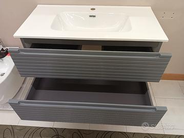 Causa svendita, svendo mobile bagno completo come in foto, 90x45, color grigio scuro laccato opaco effetto millerighe, 2 cassetti con lavabo integrato in ceramica e specchio 90x60 e led. Nuovo. Ditta Italiana, Belbagno Italia, serie Easy Diana