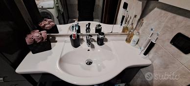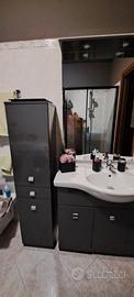 Mobile composto da base con lavabo e rubinetteria in ottimo stato. Ampio specchio con faretti. Colonna laterale indipendente posizionabile sia a dx che a sx sia in altro spazio. Maniglie usurate ma cambiabili. Macchia sulla base dello specchio che si può comprare con adesivi decorativi da specchio.