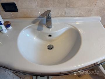 Mobile bagno effetto legno Largo 1 metro profondo 50 cm nella parte piu sporgente del lavandino e 35 nella parte del mobile sottostante Completo di portasciugamani e miscelatore Due punti del lavandino presentanoleggere venature come da foto