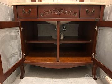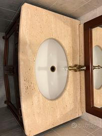 Vendo mobile bagno in legno massello color noce scuro con piano in travertino - piano in travertino (spessore 2 cm) - base con 2 cassetti, 2 ante e 2 ripiani interni in legno - lavabo ovale in ceramica bianca marca Idealstandard - rubinetteria in ottone/bronzo - Misure del mobile: 92 larghezza x 58 profondità A completare il mobile bagno specchio abbinato con base sempre in legno massello color noce scuro - misure specchio: 105 altezza x 80 larghezza (110 altezza comprensivo di zoccoletto di giunzione mobile/specchio) - n.2 lampade applique satinate e con base in bronzo Ritiro a carico acquirente a Breda di Piave