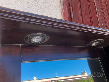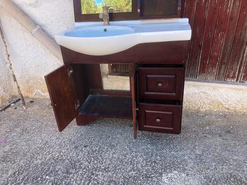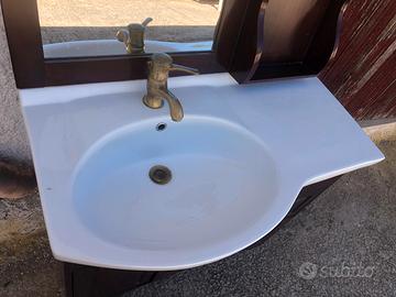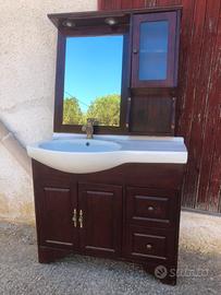 Mobile bagno comosto da: mobile con due cassetti e ante, lavandino in ceramica, rubinetto miscelatore e scarico colore bronzo antico, specchiera completa di mobiletto e luci spot. Eventuale spedizione a carico dell’acquirente.