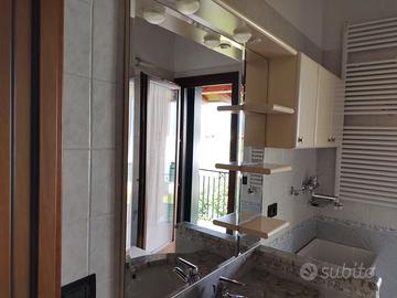 Vendesi mobile bagno composto da lavabo con top in marmo grigio-verde e rubinetteria F.lli Frattini, mobile sotto lavabo a due antine bianco-avorio con porta asciugamani incorporato, specchiera completa di faretti, tre mensole e pensili a parete. Buone finiture e condizioni. Il mobile viene consegnato smontato ed imballato. Prezzo trattabile.