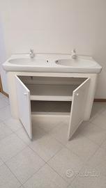 Mobile bagno colore bianco con due lavandini e rubinetteria, completo di due ante e piano intermedio. Trasporto a carico dell' acquirente.