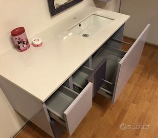 Occasione d'esposizione, nuovo. Mobile bagno di 122x51 cm. con frontali in vetro lilla e viola composto da 4 cassetti e un cassettone sotto il lavabo. Il lavabo è in ceramica sottopiano. Il piano è in quarzo bianco spessore 2 cm.