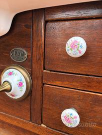 Arredo da bagno in Ebano made in Italy, con lavabo da appoggio in ceramica. Due cassetti per lato con pomelli in ceramica decorata e portasciugamani in ottone antico rifinito con dettagli in ceramica decorata. Il lavabo è provvisto di Miscelatore con scarico automatico e finitura cromo lucida. In basso si trova un ulteriore e comodo ripiano in legno.