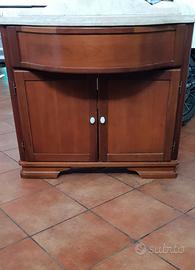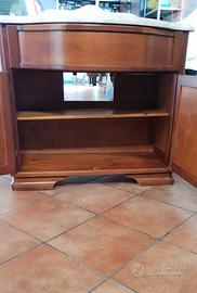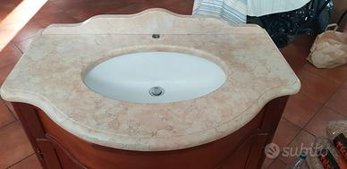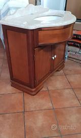 Mobile bagno completo di lavabo in legno massello di qualità. Le misure sono: la parte centrale sporgente superiore del marmo e larga 62.5 cm. e laterale 41 cm. Lunchezza totale superiore con marmo 98 cm. mobile 94cm.