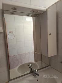 vendo mobile bagno con lavandino in porcellana composto da 3 cassetti laterali, scomparto con mensola interna con portelle, in aggiunta uno specchio compreso di faretti a led, scomparto con 2 mensole in vetro e chiusura con portella. Prezzo trattabile.
