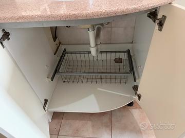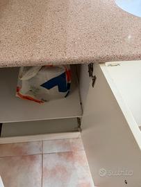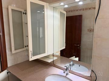 Mobile bagno molto spazioso, compreso di lavandino, piano in marmo, specchio grande, armadietto laterale, 2 vani sottostanti con scaffali e contenitore detersivi.