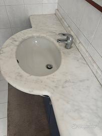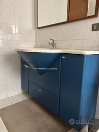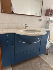 Mobile bagno Antonio Lupi Design. Struttura in legno laccata blu, maniglie in acciaio e piano in vero marmo chiaro con lavabo incassato
