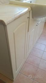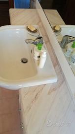 Causa rinnovo bagno vendo mobile bagno marca Seresi in legno bianco con sportelli bugnati, piano e alzatina in marmo rosa venato, specchiera con faretti in vetro.
