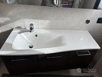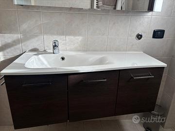 Vendo mobile bagno in legno con tre ante compreso di lavabo e annesso specchio contenitore con due ante e lampada. Misure mobile: L110 x H45 x PROF 38 Misure specchio: L110 x H60 x PROF 17