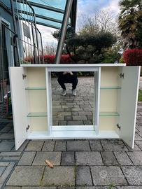 Vendo elegante mobile bagno con specchio centrale e due pratici vani laterali con ante, completi di ripiani interni in vetro. Struttura colore bianco, design pulito e moderno, adatto a bagni contemporanei o classici. Il mobile è composto da: * Ampio specchio centrale * Due armadietti laterali con ante * Ripiani interni in vetro per cosmetici e accessori * Luce superiore integrata * Struttura solida e ben tenuta 📏 Ideale come mobile contenitore salvaspazio, molto comodo e funzionale. Condizioni molto buone, come da foto. Perfetto per chi sta arredando o rinnovando il bagno senza spendere cifre elevate. 📍 Ritiro a mano. 💰 Prezzo trattabile.