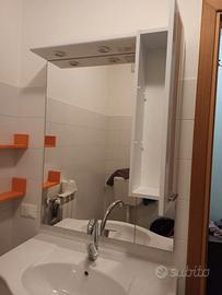 Mobile da bagno composto da base con lavabo integrato e specchiera con vano contenitore. Il set è in finitura bianca, dal design semplice e funzionale, ideale per bagni di qualsiasi stile. Base con lavabo Dimensioni: 103 × 80 × 38 cm (L × H × P) Lavabo in ceramica con vasca ampia e bordo sagomato Foro per rubinetto già presente (miscelatore non incluso) Foro di troppo pieno Struttura con ante a battente e ripiani interni per un buon spazio contenitivo Ideale per detergenti, asciugamani e prodotti da bagno Specchio con pensile laterale Dimensioni complessive: 103 × 80 cm (L × H) Pensile laterale con anta e ripiani interni Illuminazione integrata nella parte superiore (pannello luce) Profondità standard da pensile bagno (non ricordata, ma generalmente 12–16 cm)