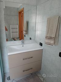 Vendo mobile bagno con specchio e miscelatore inclusi, due cassetti molto capienti (graffietto in basso). Laccato crema/tortora, ceramica Altea perfetta. Misure mobile: L 80 X H 60 X P 45 Misure specchio: 90x80