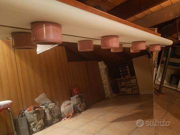 Colonna bagno color rosa e bianco, composto da mobiletto basso, mensola porta sapone e bicchiere centrale, mobiletto alto. specchio con mensolafaretti e presa di corrente