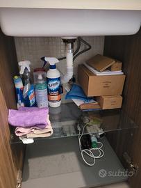 in perfette condizioni con lavandino e spazio detersivi con mensola in vetro.