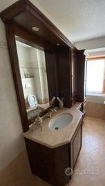 Vendo elegante mobile bagno in legno massello di rovere scuro con ripiano e inserti cassetti in marmo rosa, vetrina satinata decorata in stile country-classico.