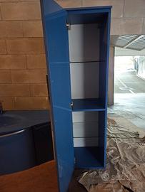 Vendo set bagno composto da mobile con lavabo integrato a piano semicircolare + colonna contenitore. Finitura laccata blu lucido, rubinetto cromato incluso.
