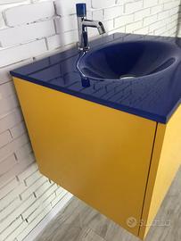 Lavandino integrato in vetro blu, mobile sospeso giallo vivace, miscelatore con leva blu coordinata.