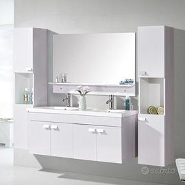 WHITE ELEGANCE è il modello più completo della nostra gamma di arredo bagno. Composto da mobile bagno + 2 mobili colonna + specchio + 2 lavabo. Dal design moderno e struttura in MDF, resistente nel tempo.