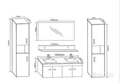 Dispone di uno specchio di 110 x 60cm, 4 antine e 2 mobili a colonna.