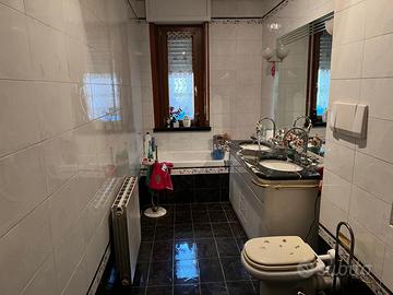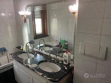 Vendesi mobile bagno doppio lavello buono stato con base in marmo nero e maniglie ottone compreso di specchio con bordi intarsiati. Trasporto a carico dell’acquirente.