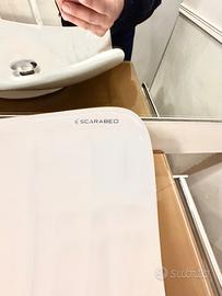 Vendo mobile bagno, design contemporaneo, come nuovo, mantenuto alla perfezione. Color beige e tortora. Ante rivestite di materiale in ecopelle molto resistente agli urti e all’acqua, con 2 grandi cestoni 65 cm larghezza, profondità 29,5 cm Piano di appoggio in vetro colorato, color tortora. Lavandini bianchi particolari nella forma, marca scarabeo, misure 50 cm larghezza, 38 cm circa profondità, altezza dal piano 8 cm. Sanitari bidet e wc bianchi tenuti molto bene misure 50 cm lunghezza, 35 larghezza. Finta scaletta in legno bianco, porta asciugamani misure larghezza 33,5 cm, altezza 160 cm Rubinetteria in acciaio inox cromato di ottima qualità. Misure mobile bagno: Larghezza 1,65 mt Profondità 39 cm Altezza del mobile 46 cm N. 2 porta asciugamani laterali estraibili aggiuntivi misura 30 cm circa Specchio comprensivo di lampadine Misure Larghezza 2,10 mt Altezza 1,30 mt.