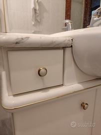 Mobile bagno con lavabo integrato e ampio specchio con mensola superiore. Colore chiaro, design classico e funzionale, completo di vano contenitore con ante e cassetti. Condizioni buone, presenta solo normali segni d’uso. Ideale per chi cerca una soluzione pratica ed economica per il bagno.