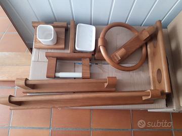 Mobile bagno e specchio con tre luci in legno, più accessori portasciugamani, portarotolo, portasapone, ecc. MISURE Mobile: Larhezza 31 x Profondità 18,5 x Altezza 69 Specchio: Larghezza 65 x Profondità 13 x Altezza 69