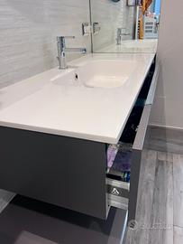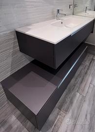 Mobile bagno sospeso in condizioni eccellenti Made in Italy Marca Ardecò Colore grigio metallizzato con top e lavabo in resina bianca Misure cm 120*50*27 Rubinetto in acciaio inox marca Newform incluso Specchio misure 88x78 con faretto led laterale Elemento superiore: top con lavabo e cassetto contenitore con apertura a gola cromata Elemento inferiore: pianale e cassettone contenitore
