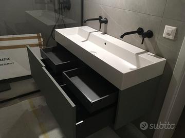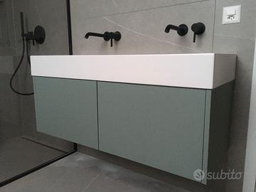 Mobile bagno nuovo imballato identico a quello rappresentato in foto. Mobile con ante in Fenix NTM verde Commodoro, due cestoni ad estrazione con due cassetti interni. Vasca unica in ceramica con possibilità di installazione miscelatori sul bordo vasca. dimensioni L. 1,2mt x P. 0,46mt Valore commerciale 4.464 euro. vendo a saldo 1.850 euro