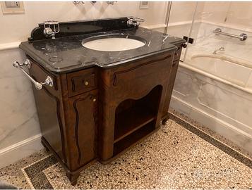 Mobile bagno in legno masello e radica con marmo nero di carrara in otime condizioni .