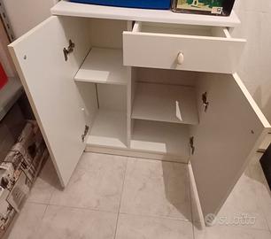 Mobile da terra con un cassetto e due ante comprensive di ripiani interni. Grande specchio da appendere con mensola annessa. Tutto in legno bianco laccato, usato ma in ottime condizioni.