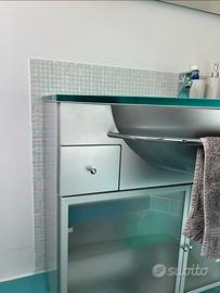 mobile lavabo da bagno con un piano in vetro di 2 cm spesso color acquamarina e una base in metallo spazzolato con ante in vetro smerigliato