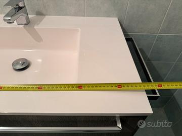 Mobile bagno grigio, con vano chiuso per lavatrice, due cassetti e lavabo incluso.